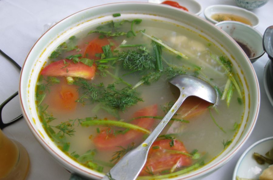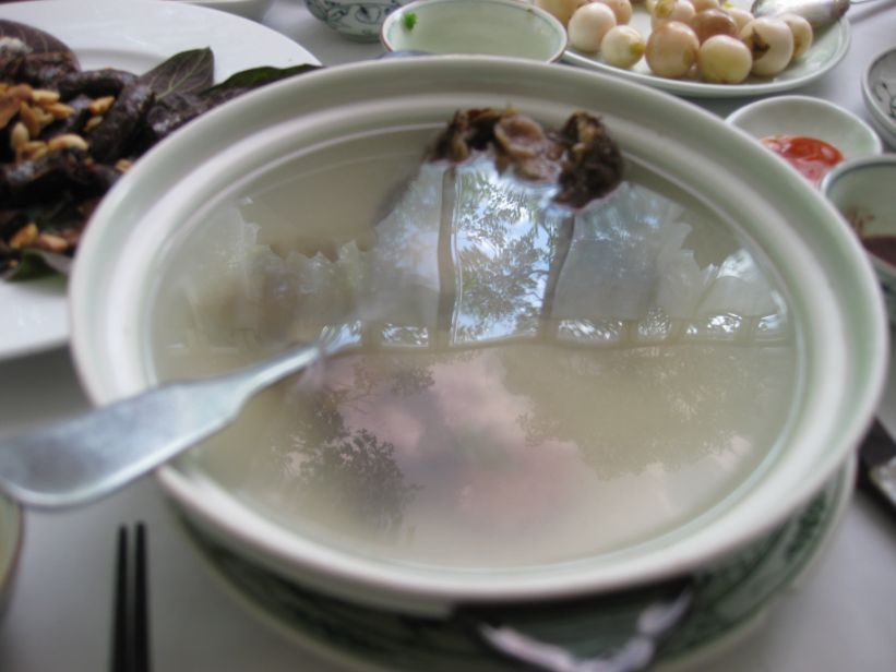 Another soup with clear broth and some type of roasted meat. Hoa can not remember what it is.