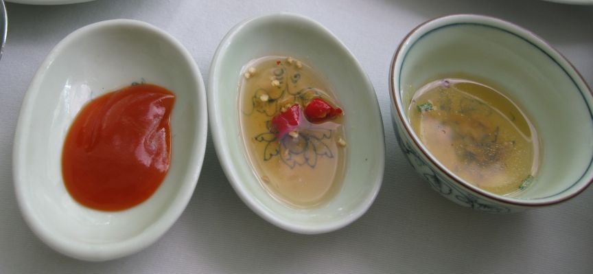 Sriracha, fish sauce with fresh chili, and ginger garlic sauce.
