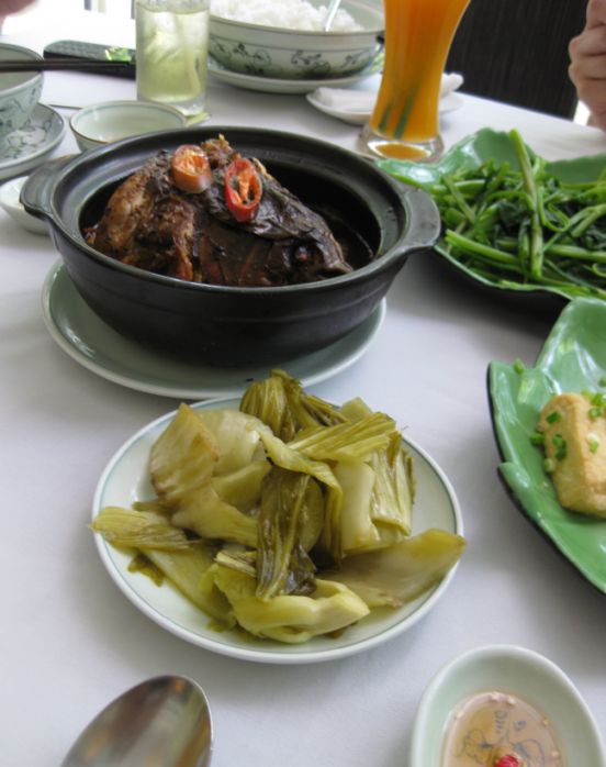 Ca kho to (Fish cooked in earthen pot), Dua Muoi (pickle mustard green), Rau mung sao (Sautéed Asian spinach) |