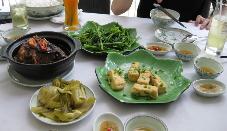 Ca Kho To, Dua Muoi, Fried soft tofu, and Rau Mung Sao.