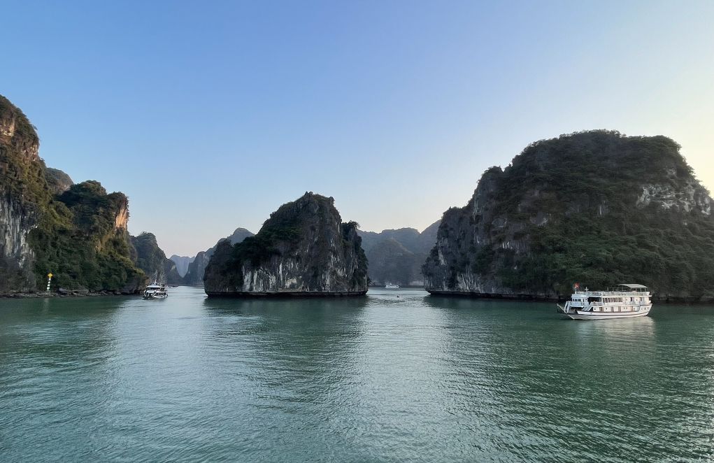 The bay is dotted with limestone islets cloaked in lush greenery, creating a mesmerizing seascape.