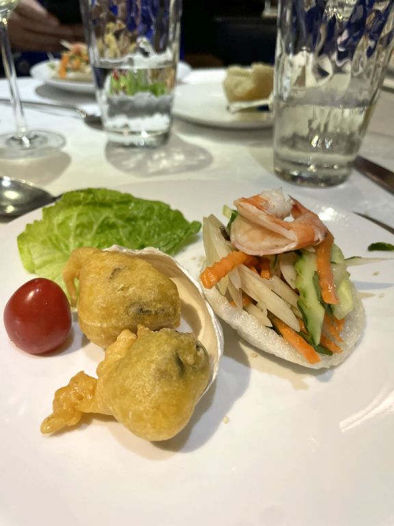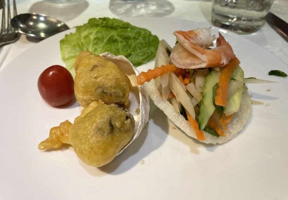 Deep fried oysters with chili salt, Lotus root and shrimp salad