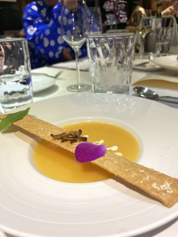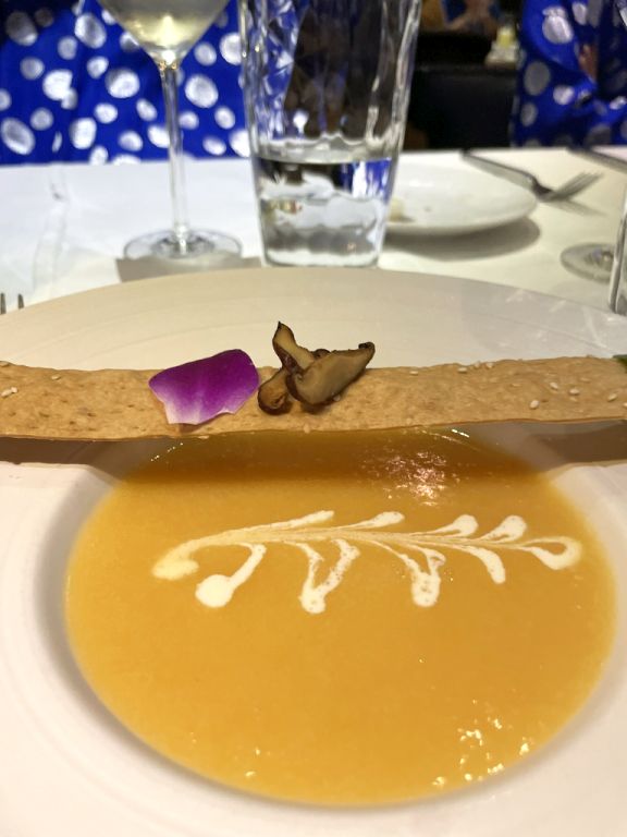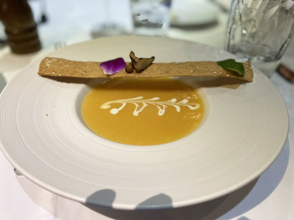 Organic pumpkin and potato soup with wild mushroom served with garlic herb.