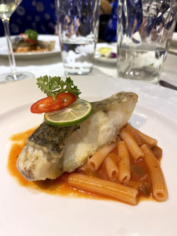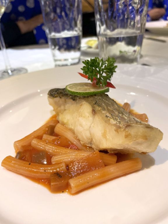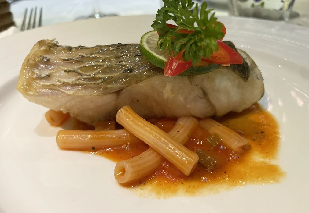 Pan Fried sea bass fillet served with ratatouille sauce and pasta