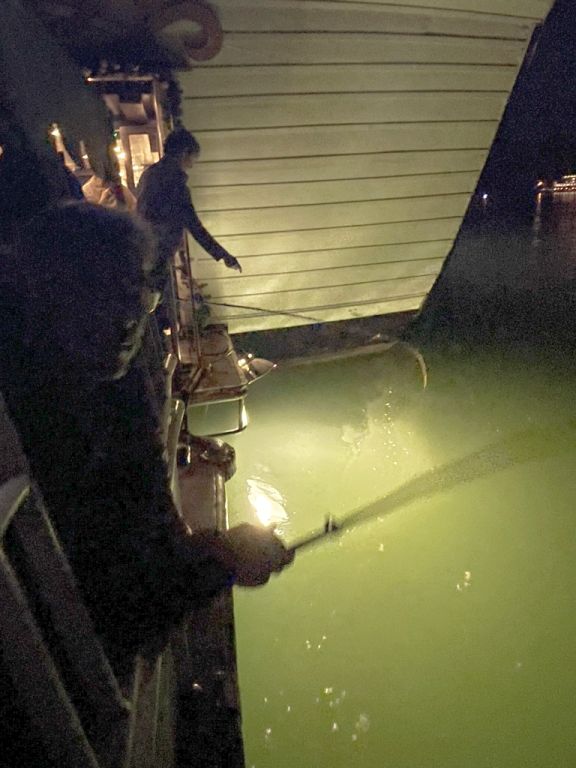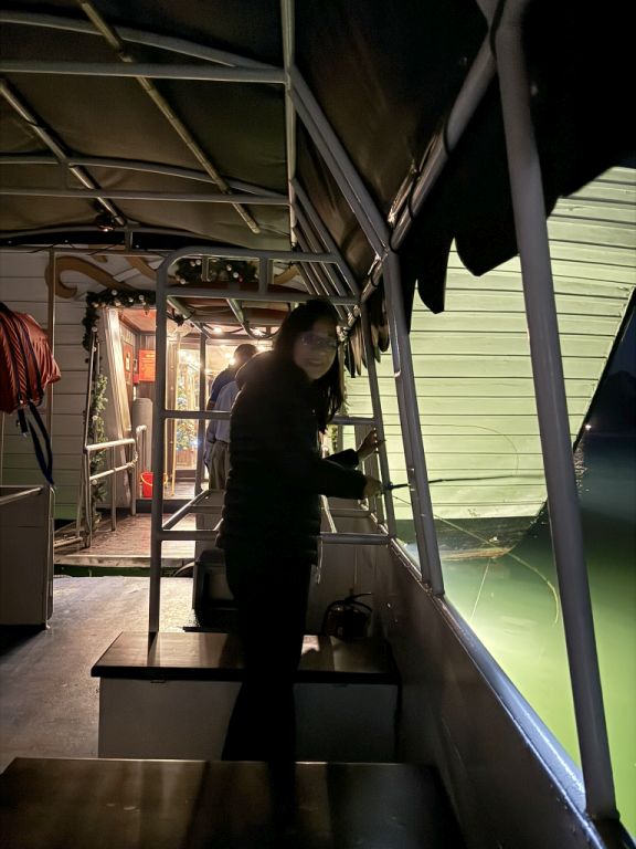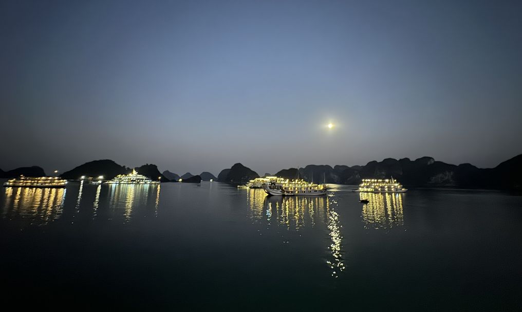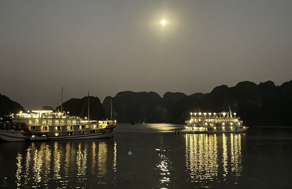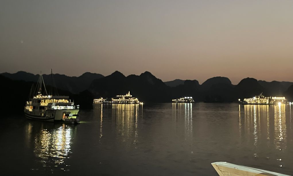 Night has set in and it is now dark. Lots of cruise boats docking in this area for the evening.