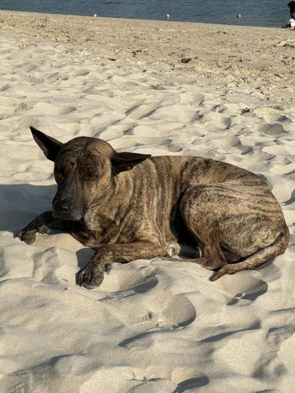 Panoramic view of the beach. Notice the dog enjoying a warm day on the beach.