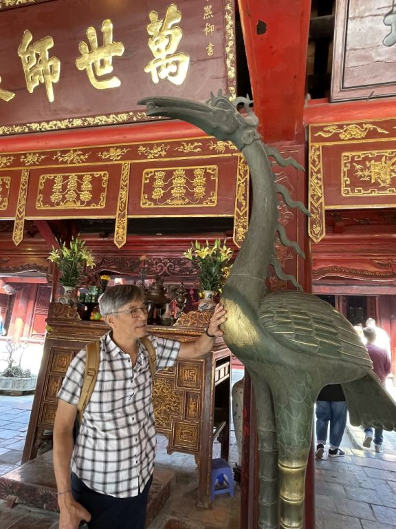Entering the Pagoda. Hoa's rubbing the belly of a Heron for luck!