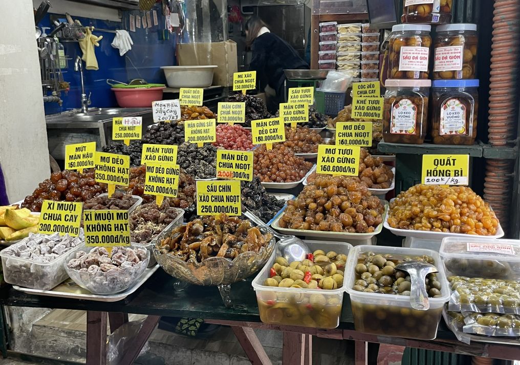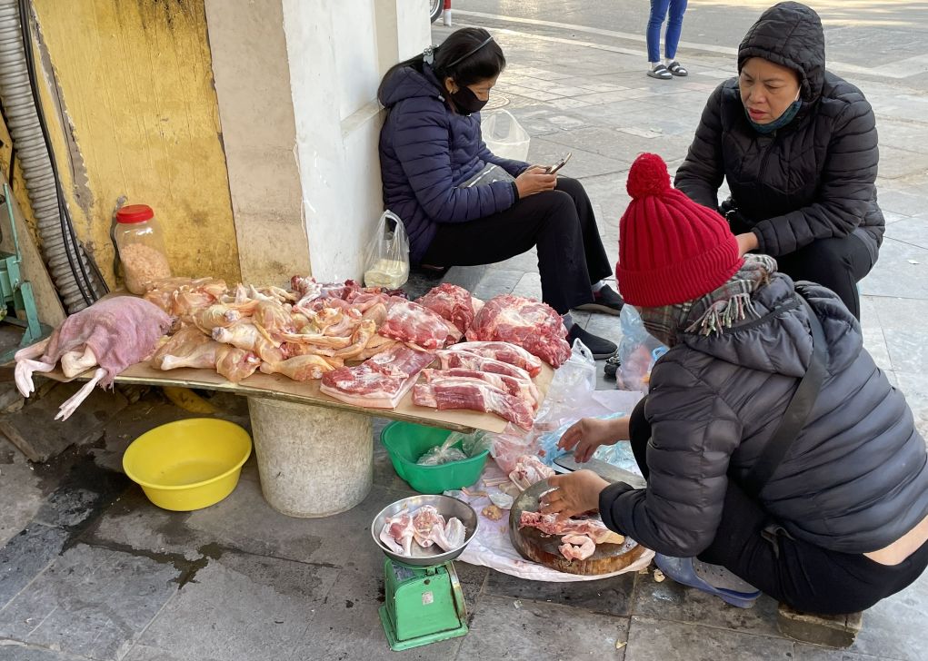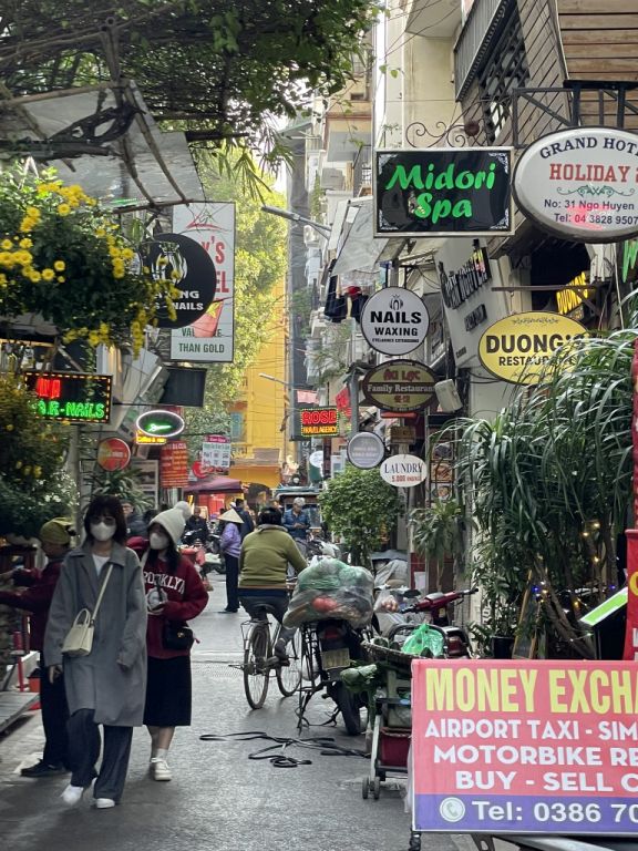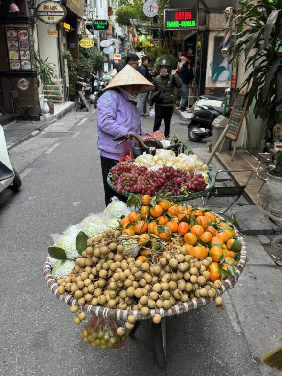 The Old Quarter is very vibrant and full of people. On the right is a lady selling fruits on her bike so she can move around and go where there are customers.
