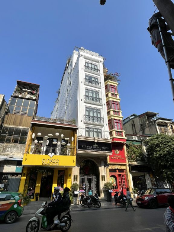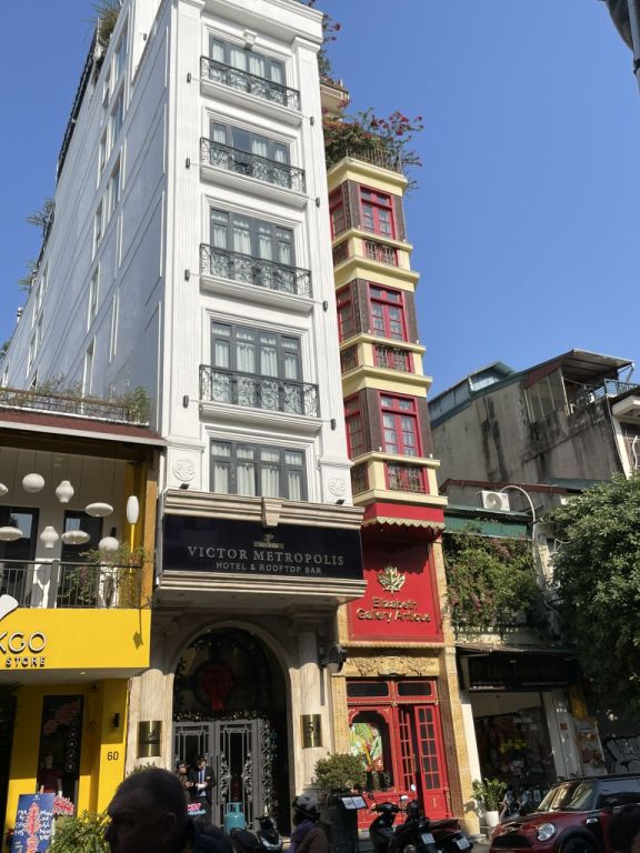 Colorful buildings in Old Quarter. The white building is the Victor Metropolis Hotel & rooftop bar.