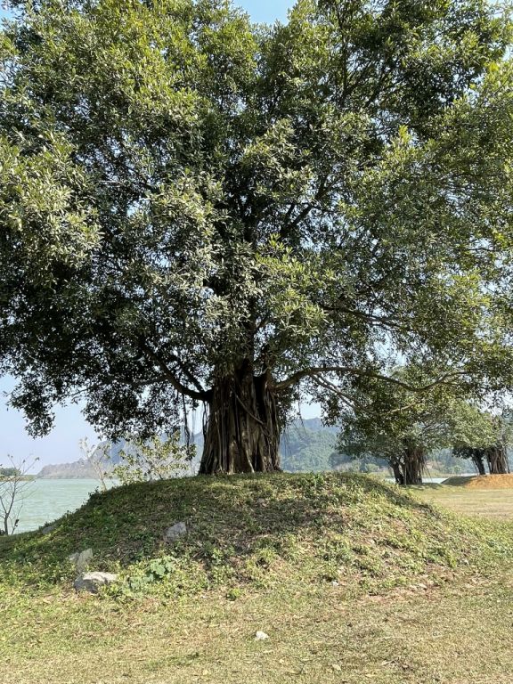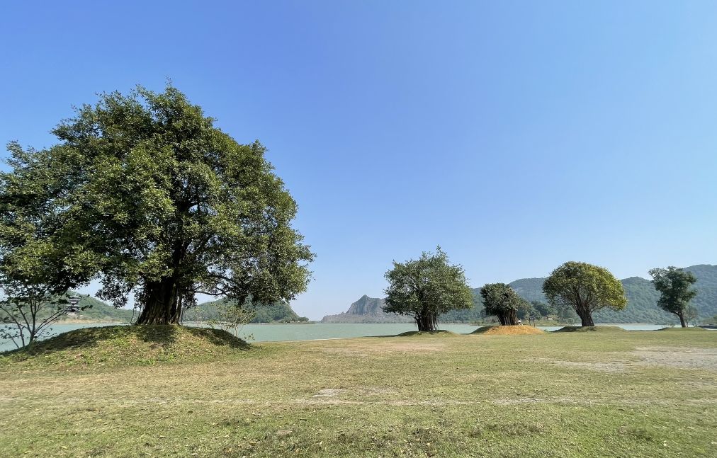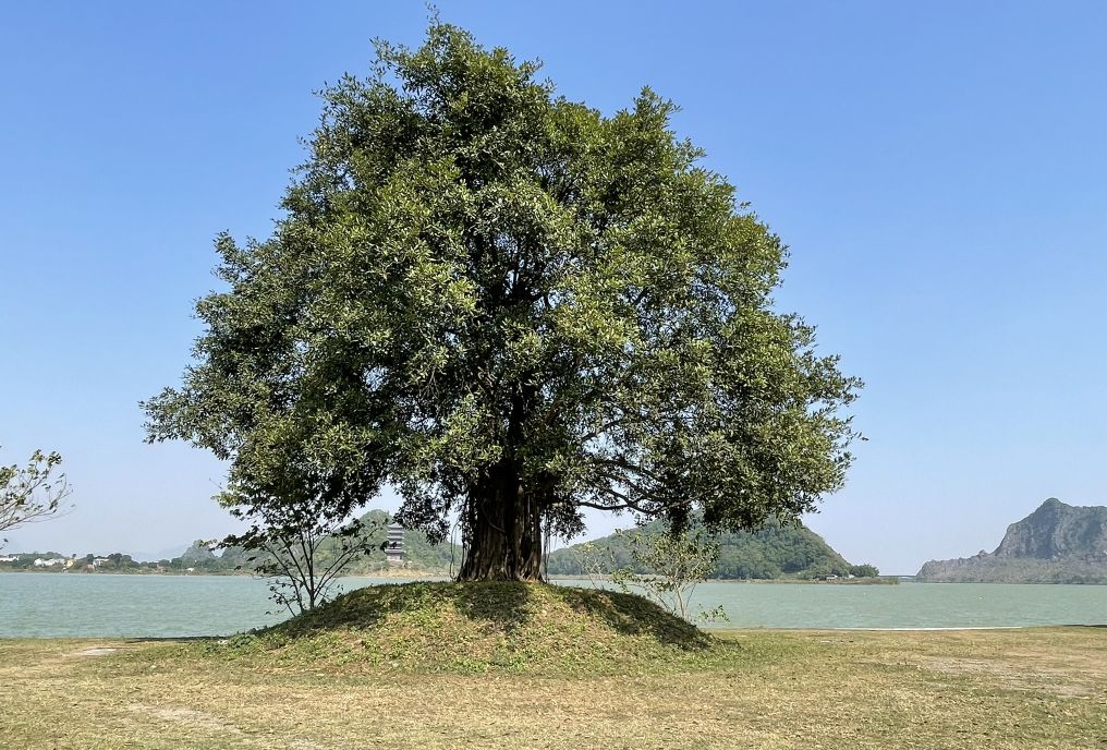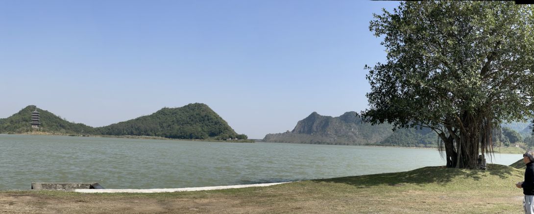 Panoramic view of the lake with Bodhi trees lining the shore and the mountains in the distance.