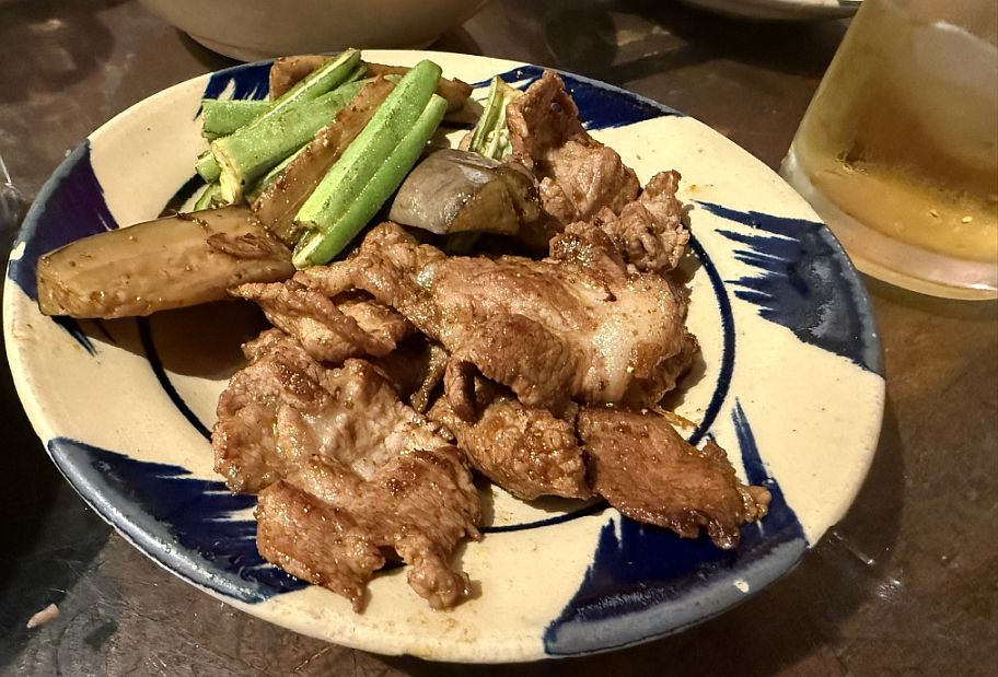 A dish of thinly sliced pork cooked with eggplant and okra.