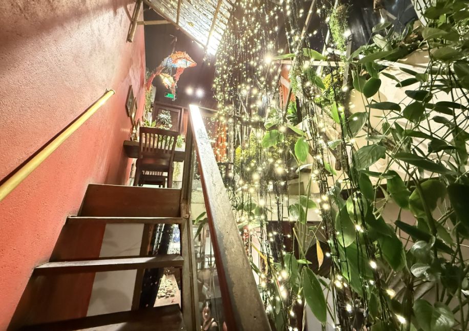 The staircase leading up to the second floor is narrow and slightly uneven, adding to that sense of history and authenticity. Walking up, you pass textured walls, old framed photos, and small decorative details that make the space feel layered and personal.