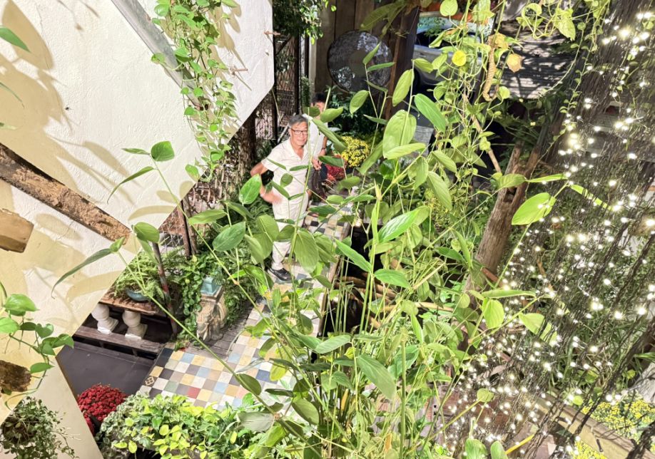 On the first floor, there is a courtyard like in every old house in Vietnam in the past. The courtyard is next to a small pond with wildflowers bushes.