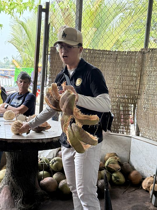 Here, everything becomes hands-on and close-up. Our guide demonstrating how to peel a coconut is the first step in a long traditional process. Using a simple but sharp tool, the thick outer husk is stripped away to reveal the hard inner shell. It’s done quickly and skillfully, showing just how familiar locals are with this fruit, which is such a big part of life in the Mekong Delta.