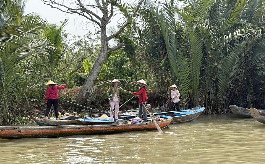 As our sampan glides deeper into the canals around Thoi Son Islet, the world feels quieter and more enclosed. The water coconut palms growing right out of the water line both sides of the canal, their roots hidden below the surface and their long fronds stretching outward. In many places, the trunks have been cut back, leaving short, weathered stubs rising from the water like natural markers of the tide and time.