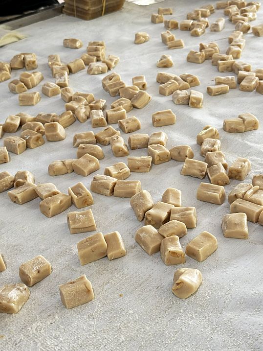 The entire process from cracking, scraping, cooking, and stretching the mixture is done right there in front of us.