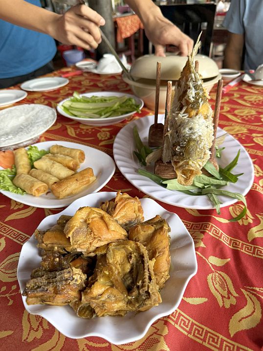 Lunch is waiting for us. Fried golden fish, cha giò (fried spring rolls), crunchy and savory, and fried chicken with steamed rice, simple but comforting dishes that round out the meal.