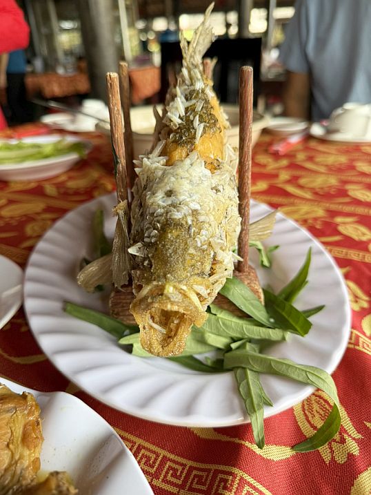 At the table, the highlight is unmistakable, a whole fried fish, deep golden and dramatically presented standing upright, supported by a wooden frame.
