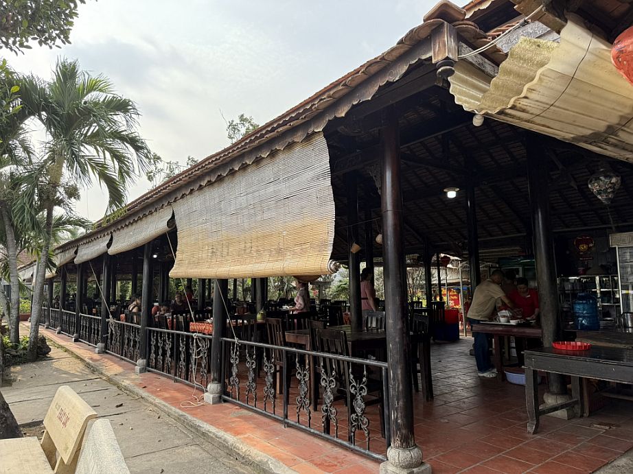 The restaurant itself feels spacious yet very much rooted in traditional Mekong Delta design. Built mostly of dark, polished wood, the structure is open and airy. The main dining hall has a high ceiling and is open along the sides, allowing natural light and river breezes to flow through. Thick wooden beams support the roof, adding to the sense of height and openness. It doesn’t feel enclosed like a typical restaurant, instead, it blends into the surrounding landscape, with views of greenery just beyond the open sides.