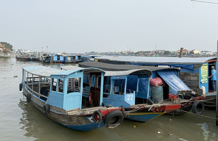 Nearby, the familiar blue-and-white wooden boats cluster together, these are the everyday workhorses of the Mekong, used for shorter trips, fishing, and ferrying visitors like you between stops. This area feels like a small river hub, where different types of boats gather before branching off into narrower waterways.