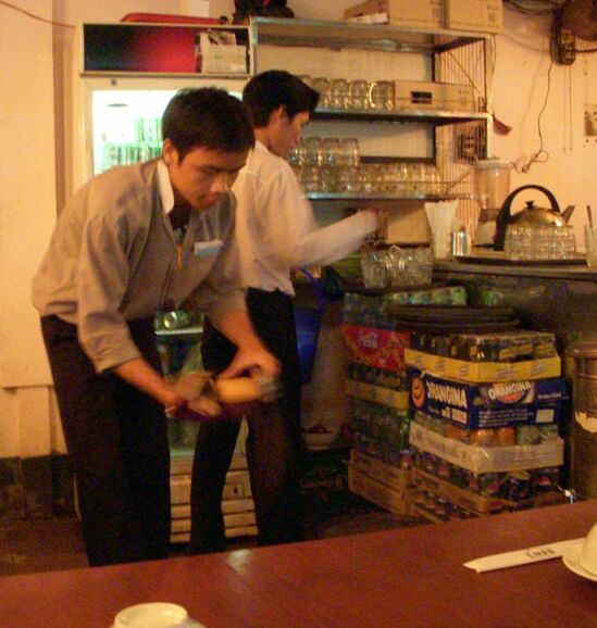 More action... The waiter broke another clay pot and is ready to throw it the other side of the room |