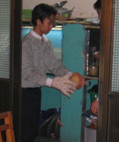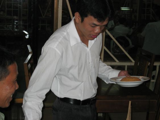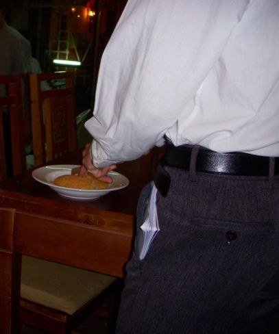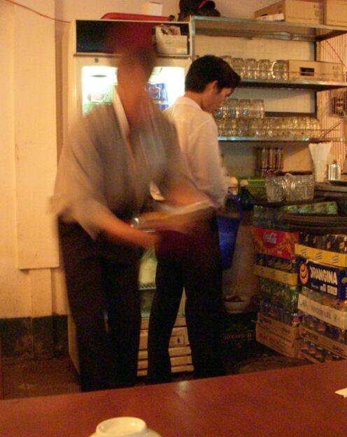 The waiter missed the rice and had to start over. Patrons just laugh and the show continues... |