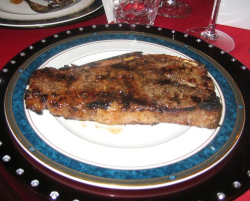 Grilled Boned-in Rancher Reserved New York steaks. They are so big! Only the kids can eat a big steak like this. For the adults we had to cut it in half. |