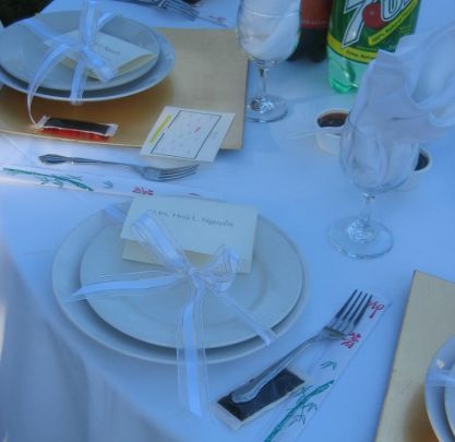 Elise cutting and tying ribbons on the plates while Thuy is making sure the table is set properly.