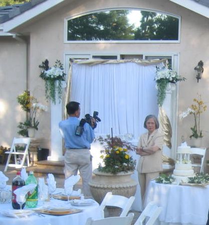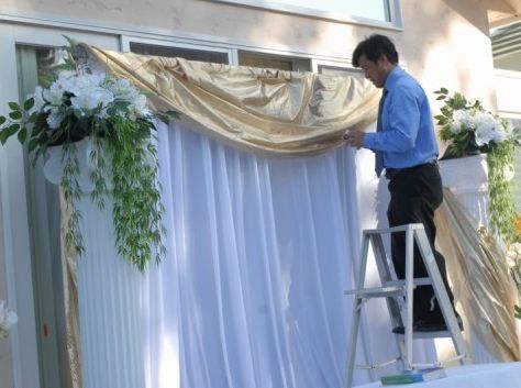 Tuan fixing the curtains... This the podium where Doan's parents will renew their vows. |