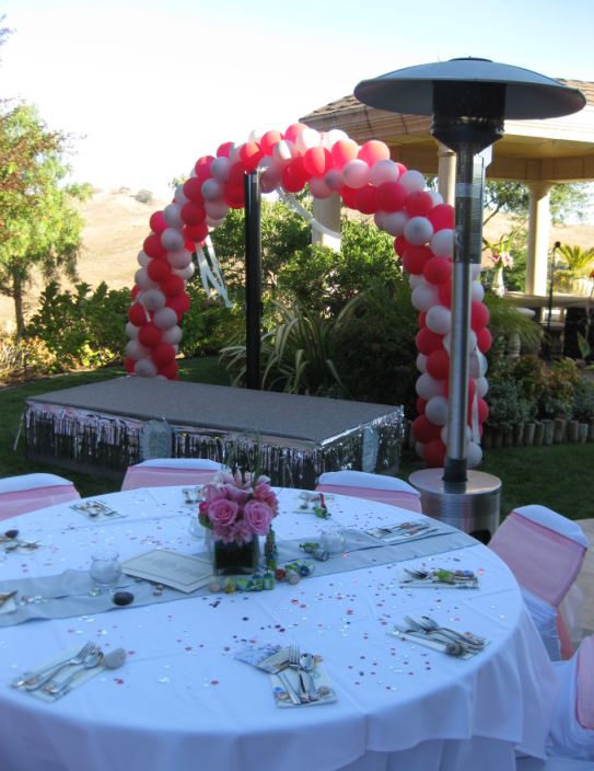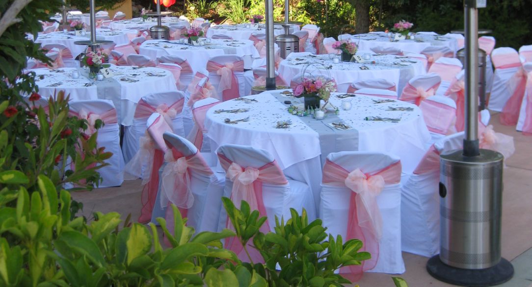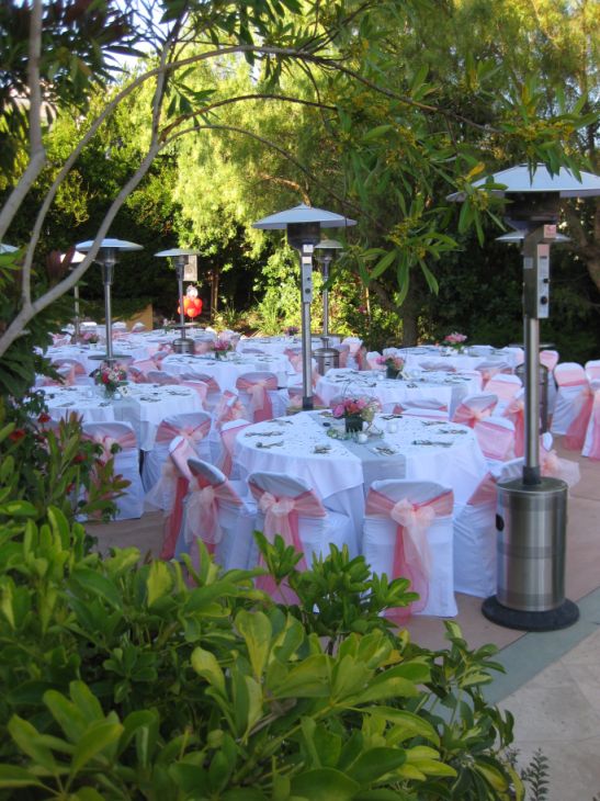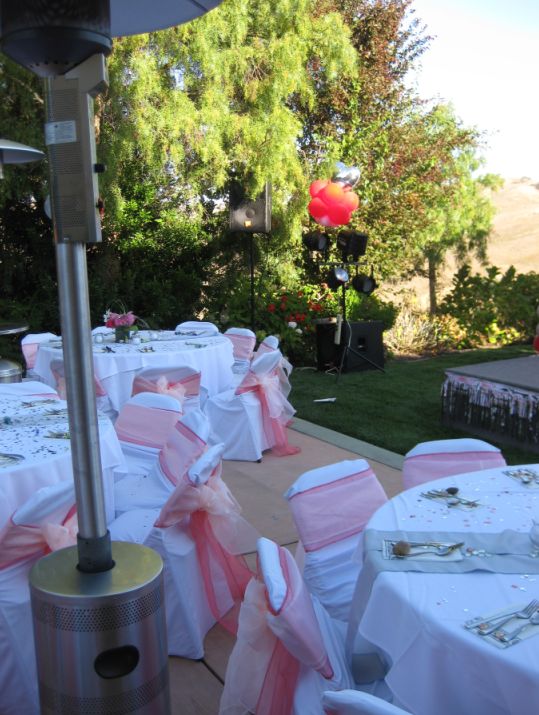 15 tables of 10 people are set up in their court yard. Because the evening is always cooler in California, heaters are definitely a must. |