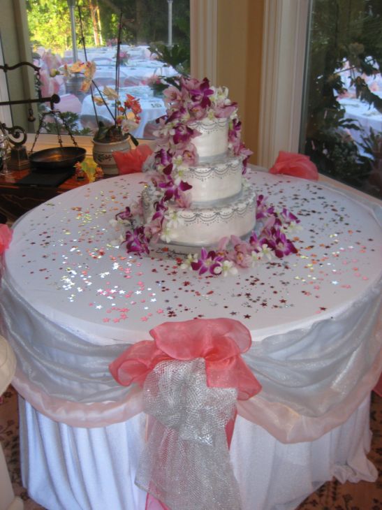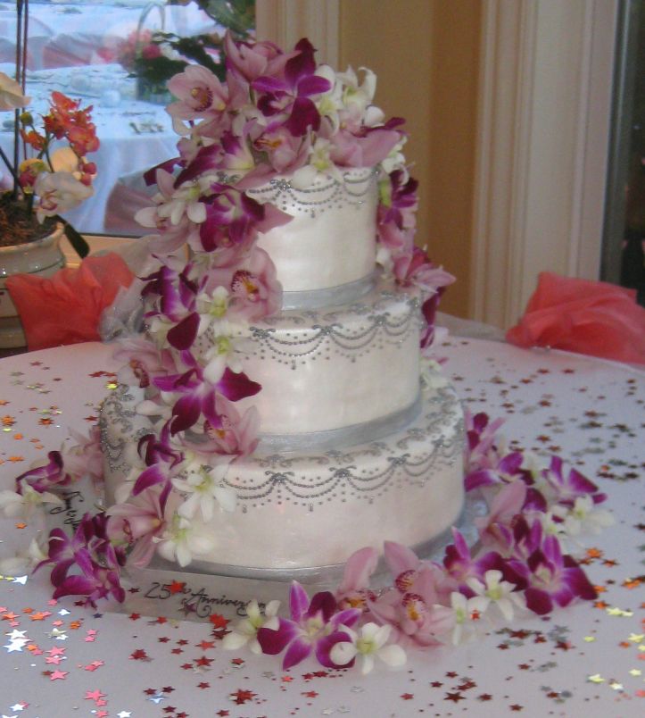 Gorgeous 3 layer white fondant wedding cake with silver ribbon and decorated with escalating orchids.