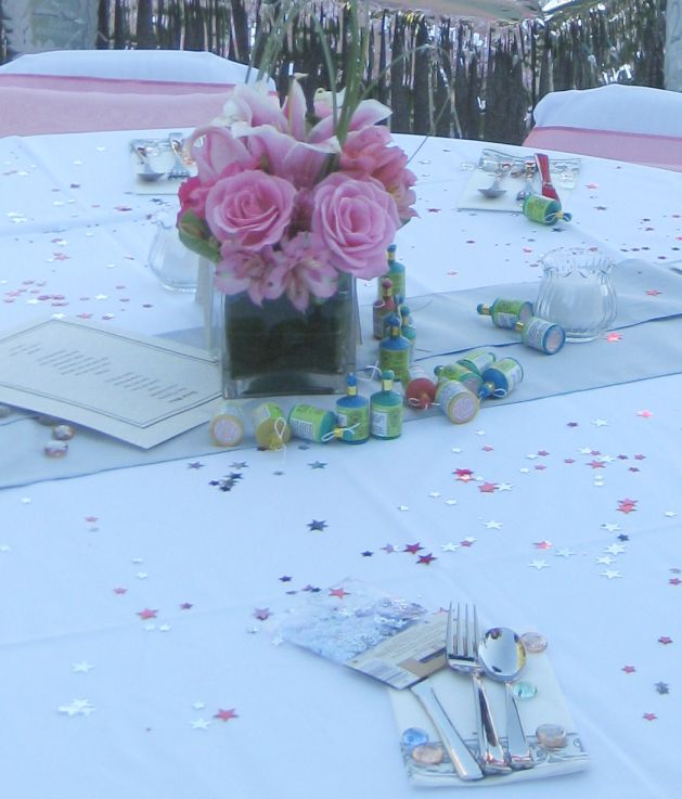 Flower center piece on each table together with with lots of party poppers to make some noise. |
