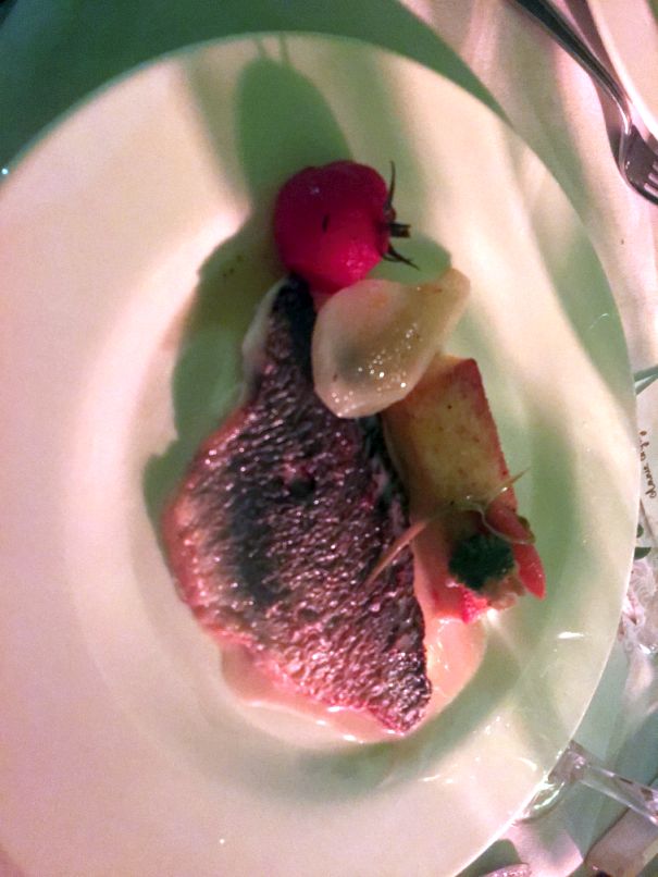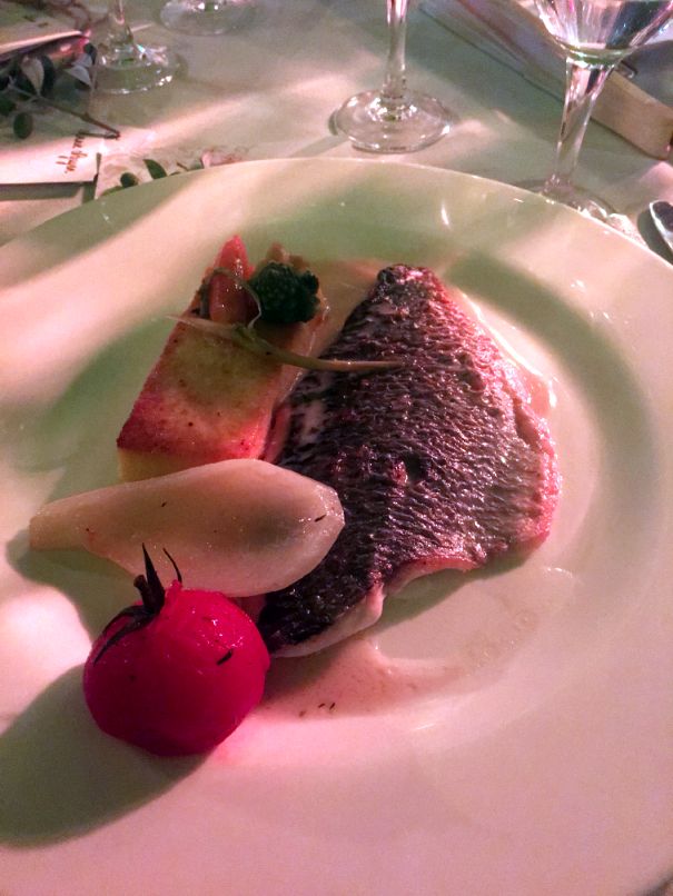 Main dish is a Sea bream with vegetable.