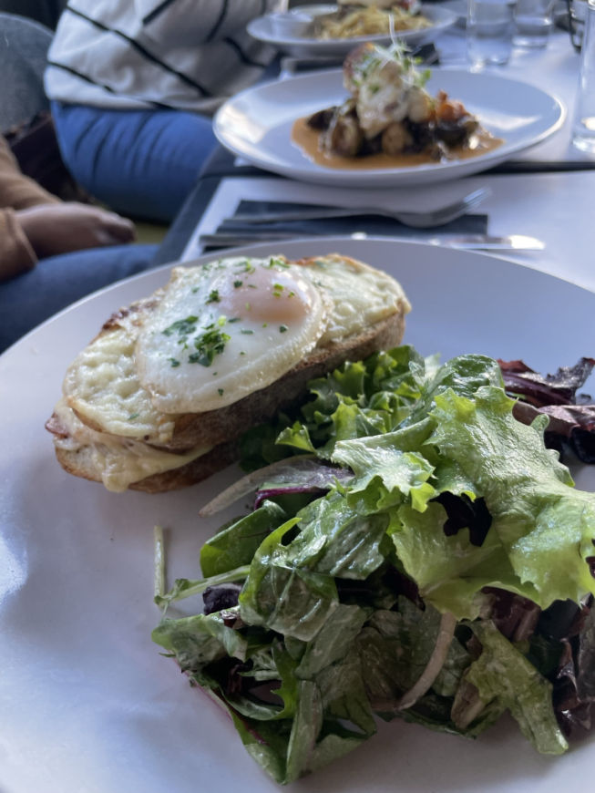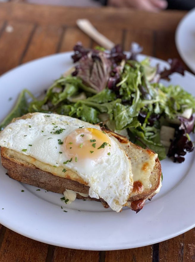 Croque Madame which is a grilled ham and cheese sandwich in a rich and creamy béchamel sauce topped a sunny side up egg.