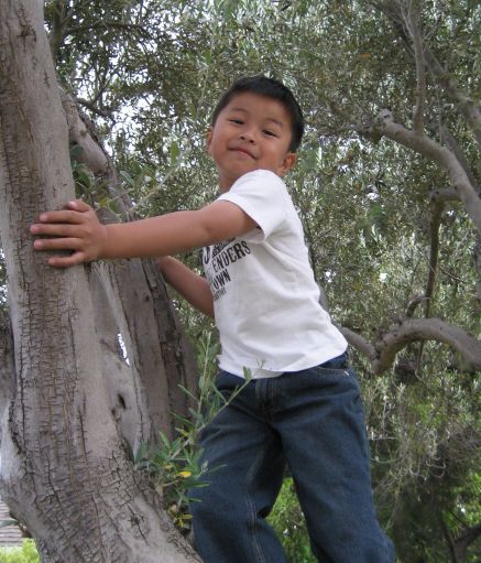 Khoi having fun while climbing the old Olive tree in our garden. |
