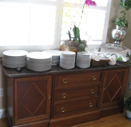 Dinner plates, Appetizers plates, and flatware are ready to be set up outside. |