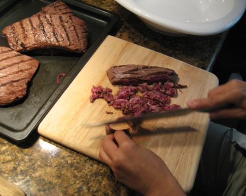 The skirt steaks are lightly grilled and then cut into small pieces. |
