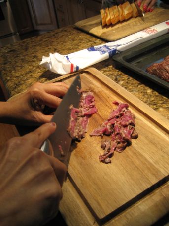 Once the meat is all cut up, green Asian eggplant, fish sauce, cilantro, lemon juice, rice powder, etc.. will be added to the dish and will become the Lao Beef salad. This is a really tasty dish. |
