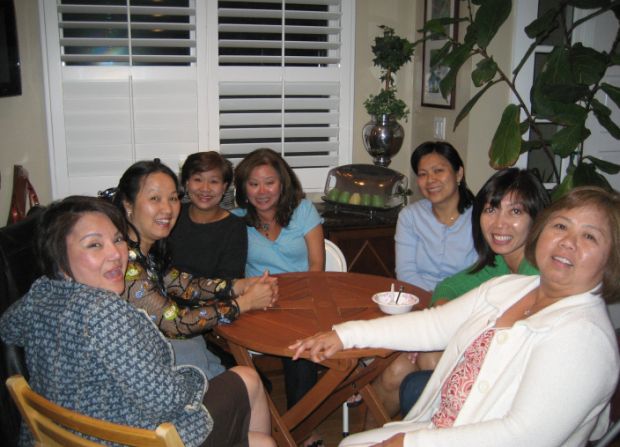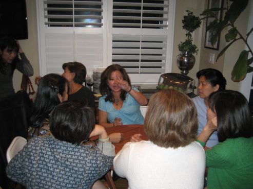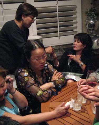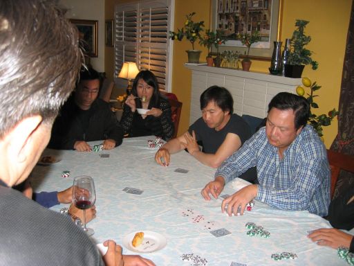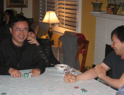 Huan's wife hide behind him because she was a little embarrassed to be photographed playing cards. |