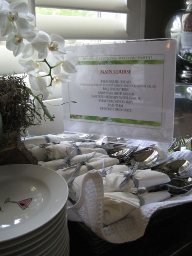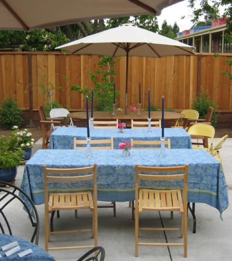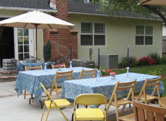 Aargh, all I could do is crossed my fingers and hope that the weather will clear later on. We are expecting a little over 60 guests and the only option is to have all of the set up in our backyard. There is no plan B! We just cannot fit 60 people inside for a sit down dinner. Fortunately, by 10:00am the rain vanished making room for a gray sky with a few rays of sunshine peaking out. I was happy! I'll take a cloudy day for this event. At least I now know, with peace in mind, that we will be able to have all the set up as planned!