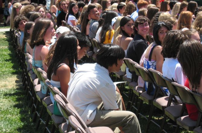 The ceremony is now over! All the students are now standing up and leaving the area.