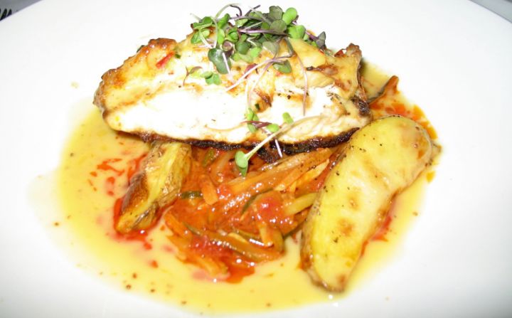 Tuan does not eat meat so he ordered the Crab crusted Halibut with orange whole grain, zucchini pomodoro, and yukon wedge.