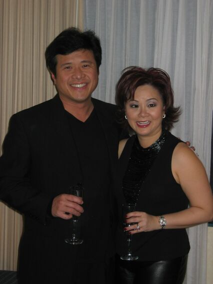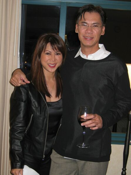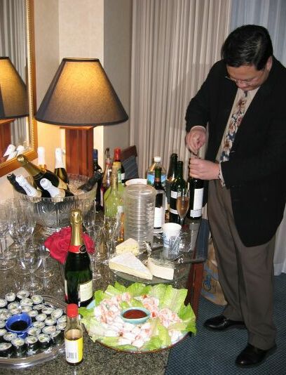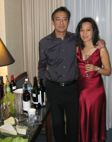 Phuc is opening a bottle of his fine wine... we called him the "sommelier" as he is very knowledgeable about wine and he always bring the best wine!!! (lucky us) We have a good view of the appetizers (sushi, shrimps cocktail, assortment of cheese) and best of all champagne and lots of good wine. |