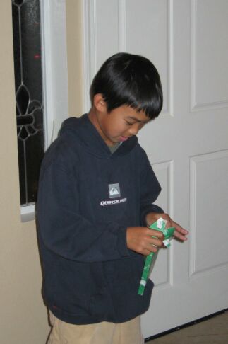Kevin opening a gift (looks an electronic game)