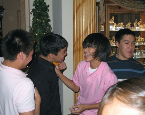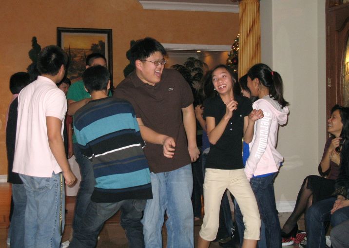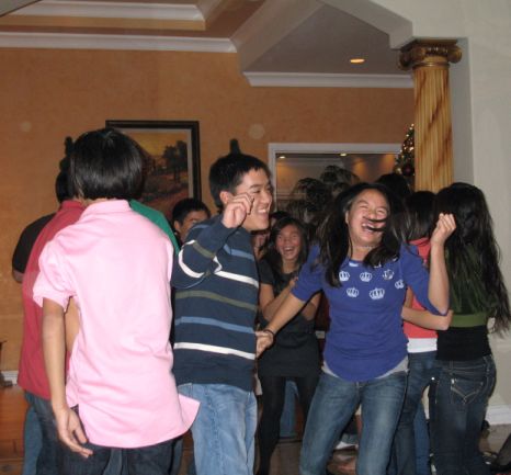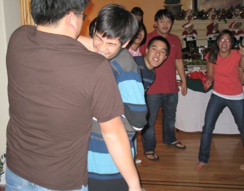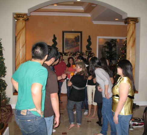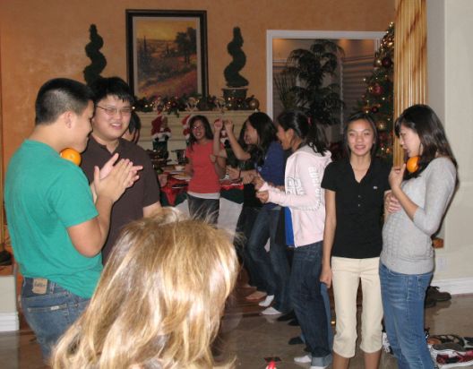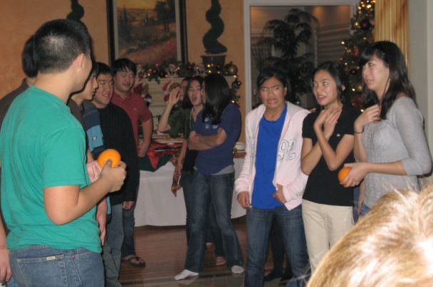 Kevin Vu trying to pass the orange to Justin while all eyes were on them. The hard part is no hands are permitted. |