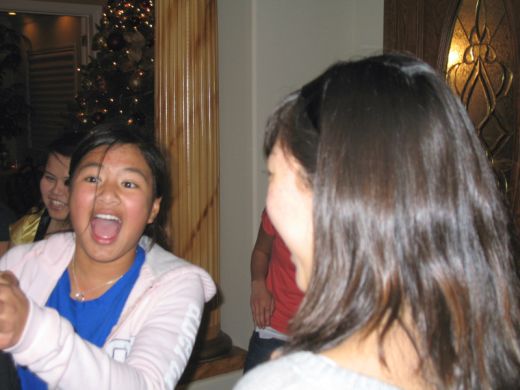 Game # 4 is called Pass the orange. Doan arranged for two teams of 8, a team of boys and a team of girls to stand in a line. Each team is then given an orange which the first person should tuck under his/her chin. The orange should be passed to the person behind. When the orange gets to the last person, they come to the front of the line and start again. The winning team is the first one which gets their starting person to the front again