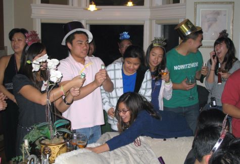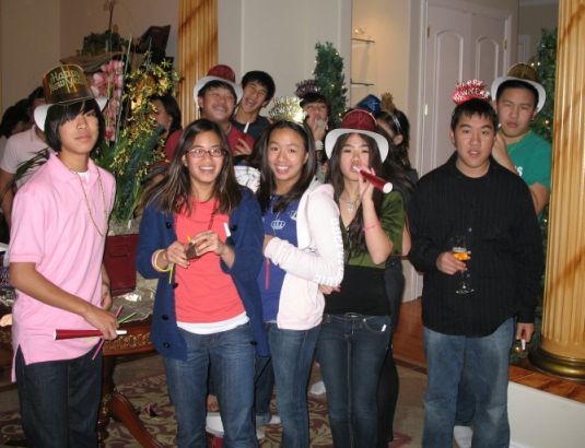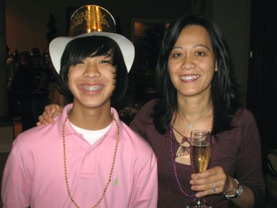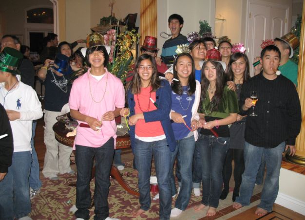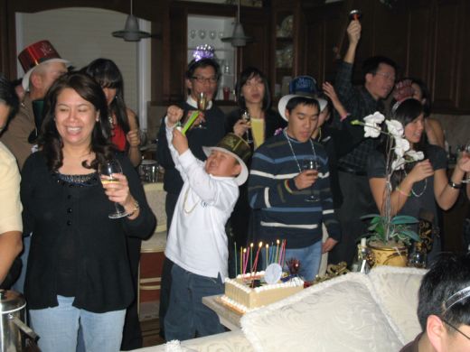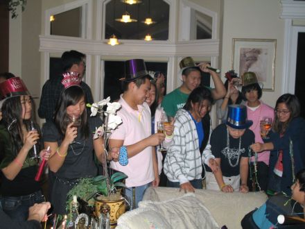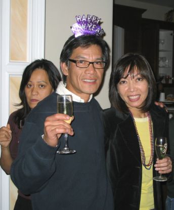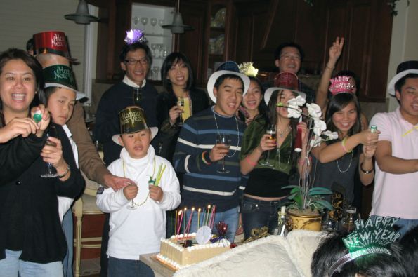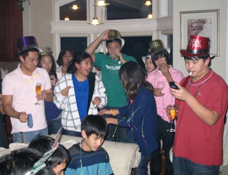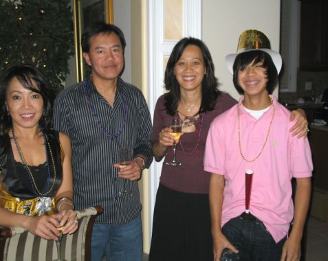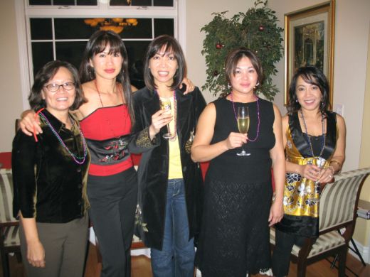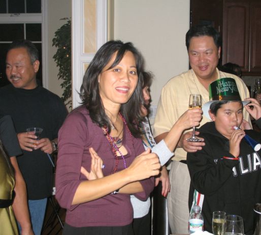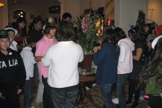 Well, we are getting close to Midnight! Doan set up a bunch of New Year's Hats, colorful necklaces, Whistles, Fringed Horns, paper Horns, serpentines thrower, etc...