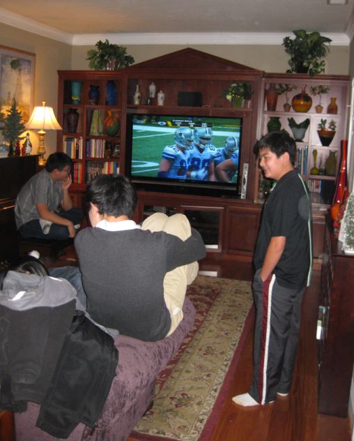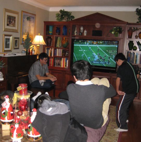 Tonight there is a great game of football on so all the kids are gathered here to watch the game.