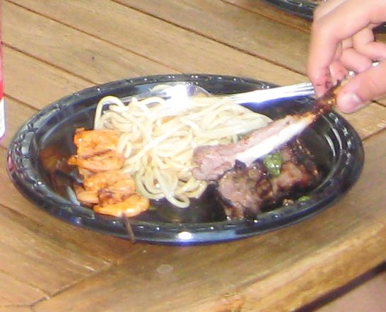 A plate with shrimps, racks of lamb with pesto sauce and lots of Spaghetti with butter and garlic! Looks pretty yummy. |