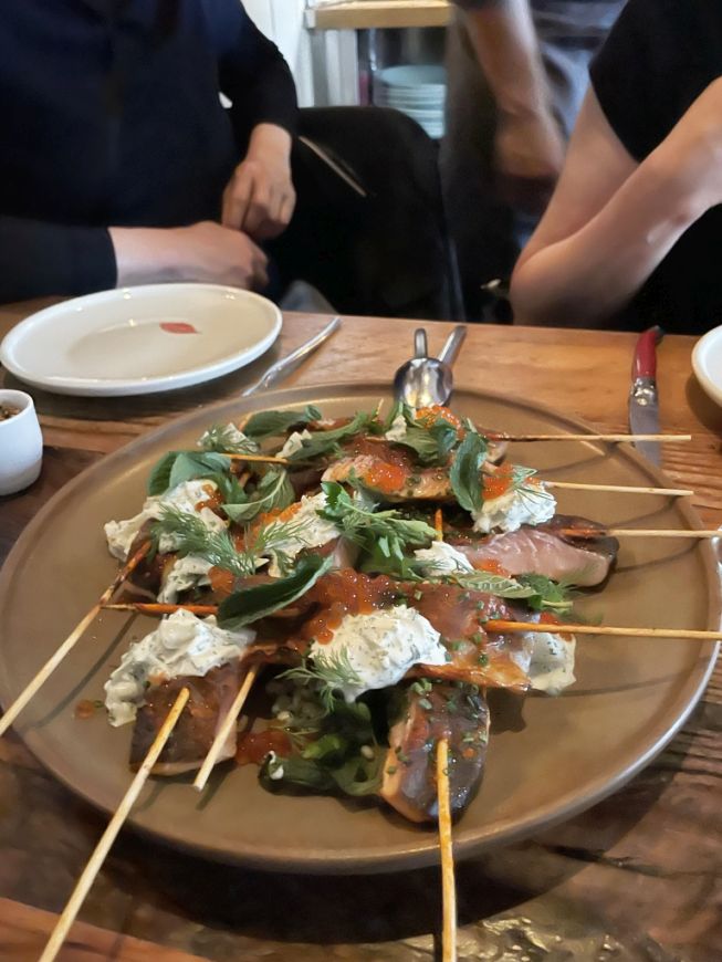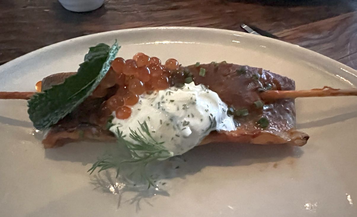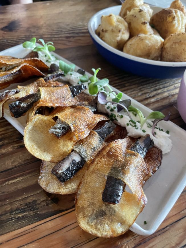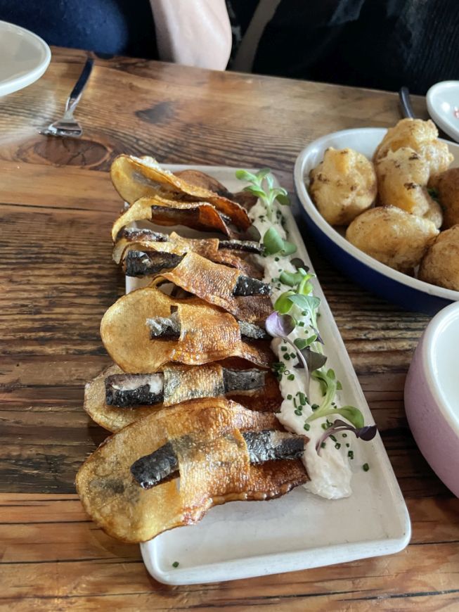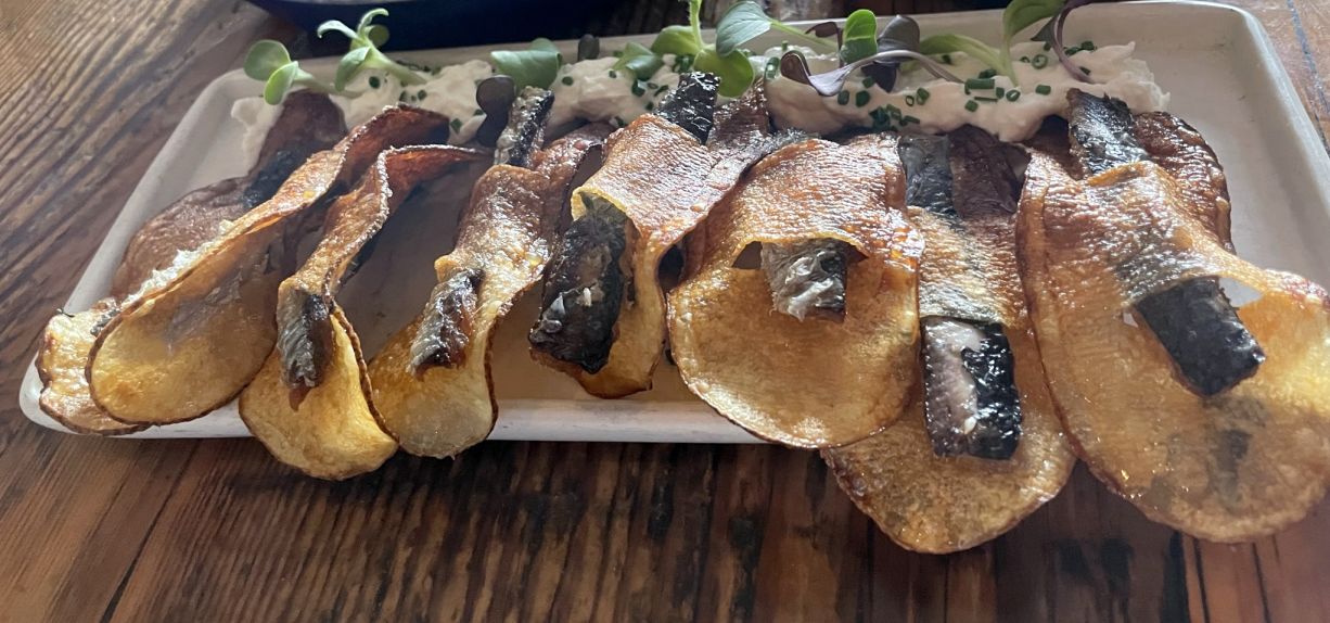 Basically it is a potato chip with a sardine woven trough it. Definitely a Wow factor when it is brought out to the table.